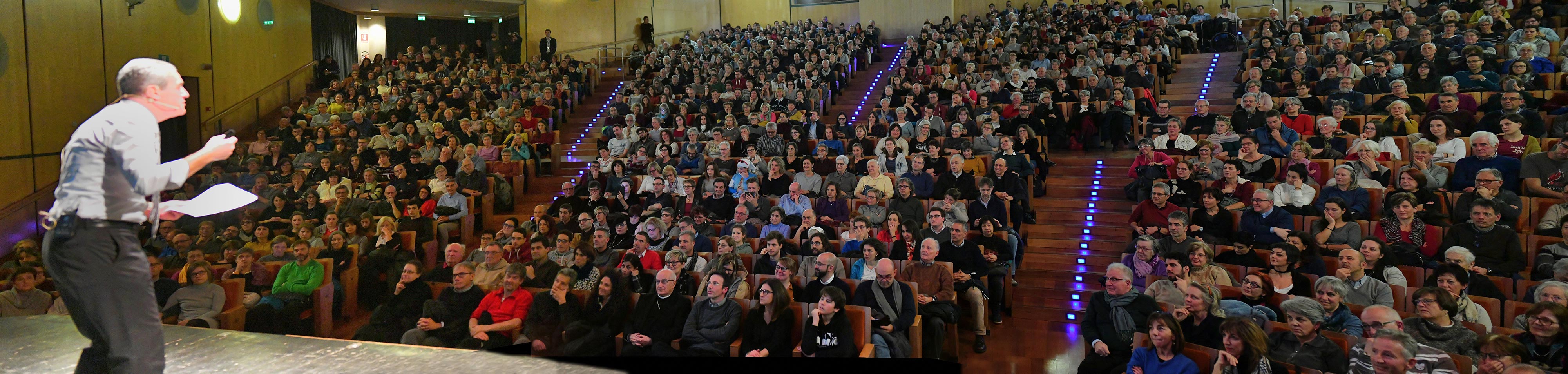 Anche il personale e i tecnici dell’Auditorium, peraltro abituati a lunghe code da Festival, sono rimasti senza parole davanti alle 300 persone in attesa martedì sera nell’atrio, senza poter entrare purtroppo. Tutto esaurito per Gregorio Vivaldelli, già mezzora prima delle 20.30, con i promotori della serata dantesca (rinviata lo scorso 29 ottobre per maltempo) a scusarsi con chi è dovuto tornare a casa. “L’aula magna dell’Arcivescovile si era rivelata insufficiente e all’Auditorium pensavamo di riuscire a contenere tutti. Ma anche qui non ce l’abbiamo fatta…ed ora ci resta forse il Palazzetto”, ha commentato nel suo saluto Paola Tomasi, direttrice della Biblioteca diocesana che al Vigilianum custodisce un antichissimo manoscritto della Divina Commedia, all’origine di questo personalissimo percorso di riflessione del biblista rivano.