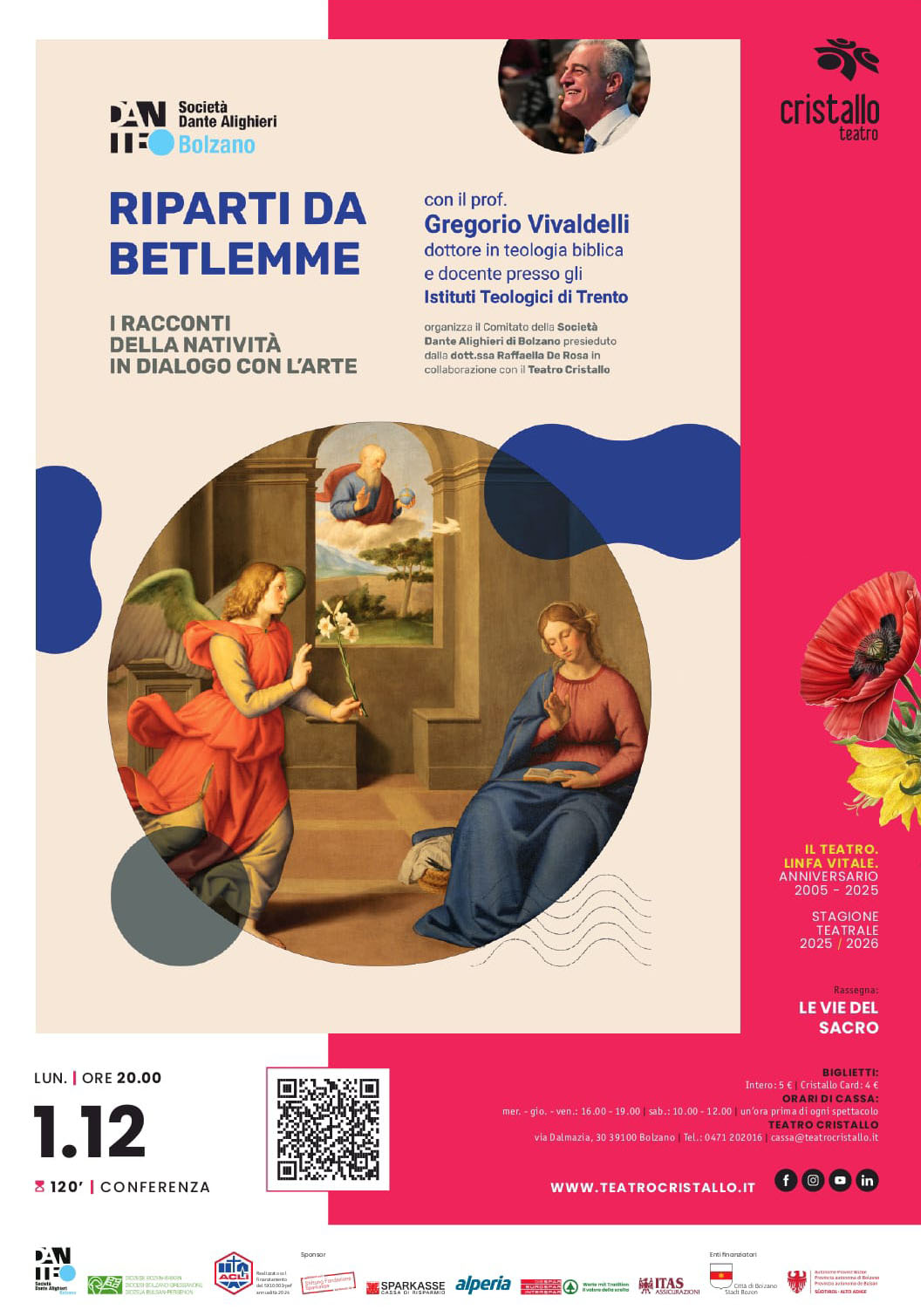 Il Comitato della Società Dante Alighieri di Bolzano, presieduto dalla Dott.ssa Raffaella De Rosa, offre alla cittadinanza una serata sul Vangelo in dialogo con l'Arte tenuta dal prof. Gregorio Vivaldelli.