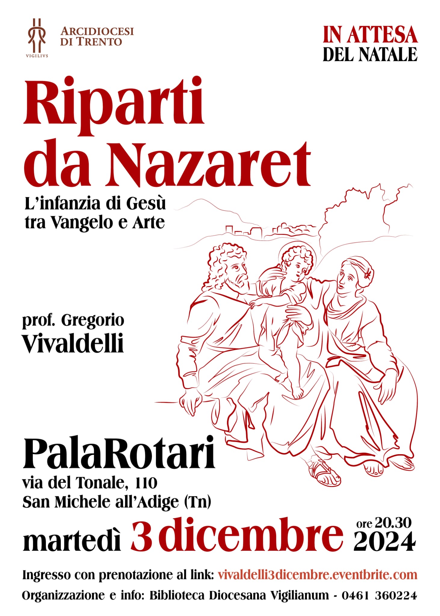 Martedì 3 dicembre alle ore 20.30 presso il PalaRotari torna l’appuntamento natalizio con il prof. Gregorio Vivaldelli, per accompagnare con un’inedita serata il cammino d’Avvento in Diocesi di Trento. Dopo aver presentato lo scorso anno la prima parte dei Vangeli dell’infanzia di Gesù (fino alla sua nascita a Betlemme), quest’anno il prof. Vivaldelli descriverà la seconda parte dei Vangeli, dalla nascita fino al ritrovamento di Gesù dodicenne al Tempio. Un racconto tutto da assaporare, in dialogo con alcune tra le immagini più belle che la storia dell’arte ci ha consegnato per immortalare la novità di un Dio che si fa bambino.