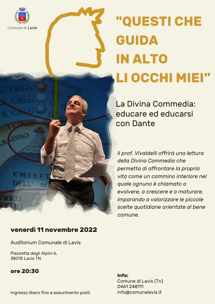 Il prof. Vivaldelli offrirà una lettura della Divina Commedia che permetta di affrontare la propria vita come un cammino interiore nel quale ognuno è chiamato a evolvere, a crescere e a maturare, imparando a valorizzare le piccole scelte quotidiane orientate al bene comune.