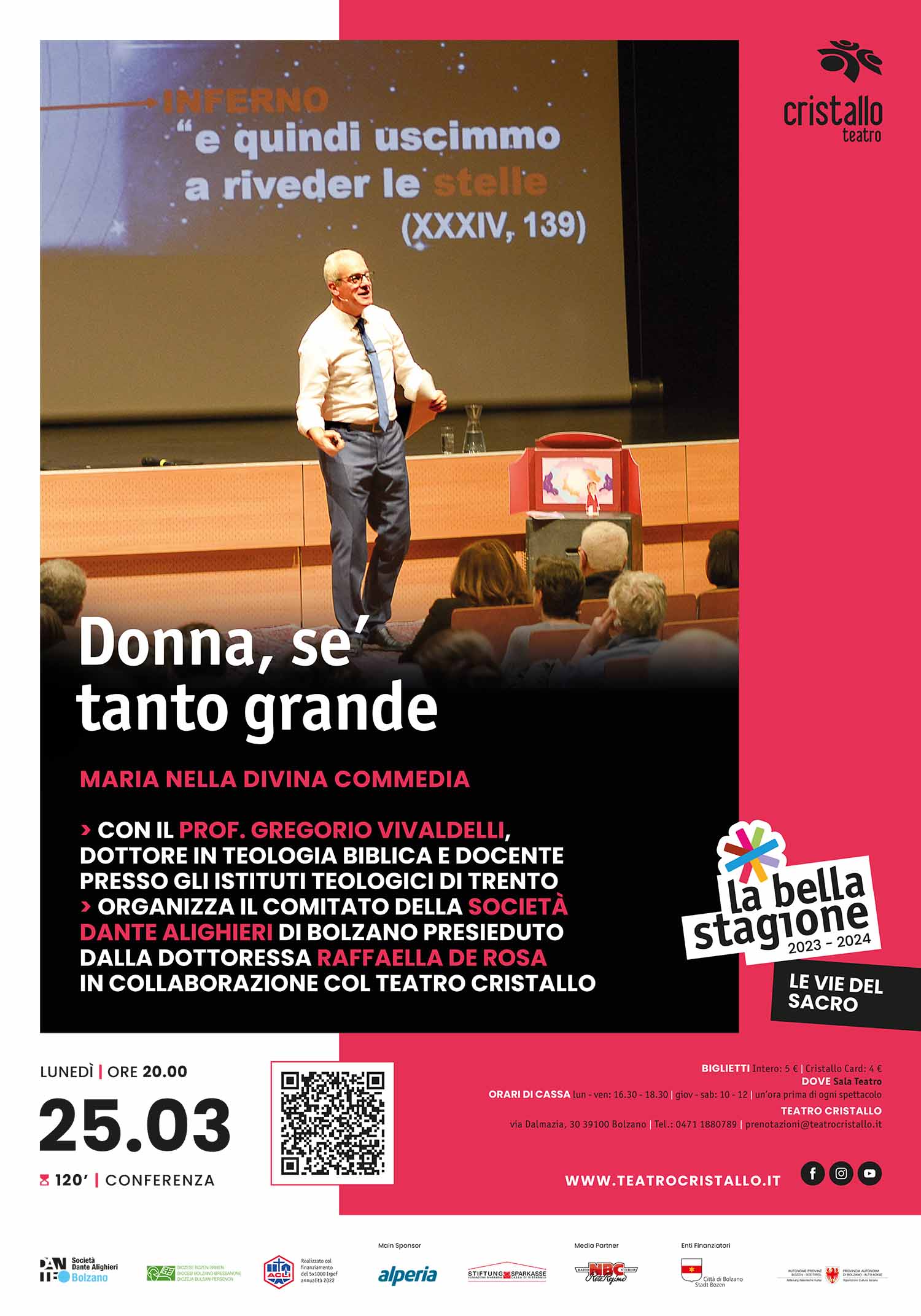 Il Comitato della Società Dante Alighieri di Bolzano, presieduto dalla Dott.ssa Raffaella De Rosa, offre alla cittadinanza una serata con la Divina Commedia tenuta dal prof. Gregorio Vivaldelli.